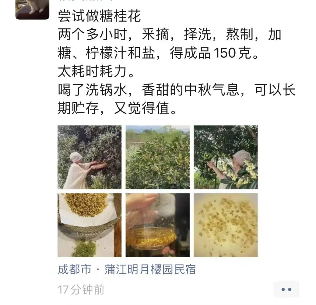 餐饮行业的@九吃 也早早地晒出桂花。此刻,再好的豆瓣香、菜香饭香,似乎都要为桂花让路。