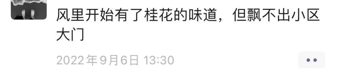 你想想,清早醒来,穿拖鞋和睡衣,听物业通知,下楼排队做核酸,途中,你意外地闻到了桂花香。沁人心脾、令人镇静的桂花香味,一把将人推进秋天里。
