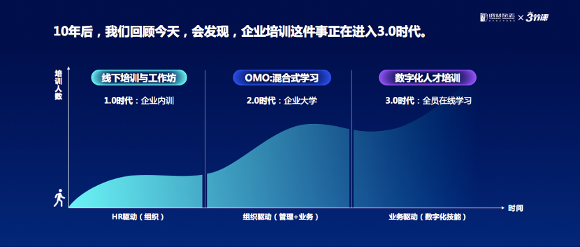 接下来,又出现了以OMO为代表的企业大学混合式培训。企业建立了企业大学,配备了一定的软硬件设施。组织驱动成为核心的驱动力,管理培训加业务培训双轮并重,这是企业培训的2.0时代。