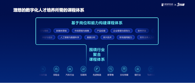 理想的数字化人才培养所需的课程体系,是一种“T”型的体系,由“一横”和“一纵”组成,“一横”代表了基于岗位和能力构建的课程体系建设,“一纵”代表了围绕行业聚合构建课程体系,能够满足数字化背景下全员培训的需求。