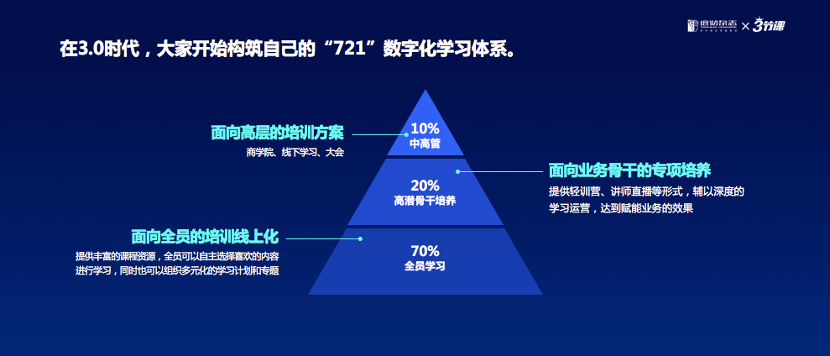 今天,我们把它定义为企业培训的3.0时代,在这个阶段,很多企业都在构筑自己的“721”数字化学习体系。这是一种金字塔式的体系,处在塔顶的是10%的中高管,中间是20%的高潜骨干培养,塔基是70%员工的全员学习。