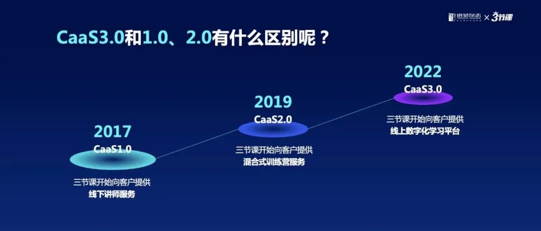CaaS其实是一个简称,它的意思是内容即服务。为什么这款产品叫 3.0 ?是因为三节课发展的过程当中,是从1.0到2.0,再到3.0 慢慢发展过来的。