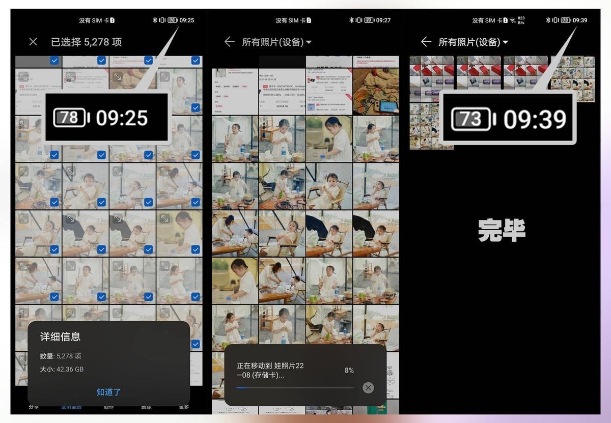 从图片的时间上可以看到,9:25分开始移动,9:37分传完,这5000多个照片和视频、42GB+文件,仅用了12分钟就存好了!除去操作用时以及结束截图慢了一点,实际用时也就是11分钟多点儿,真是又快又省事儿。现在我都有点后悔了,为什么没早发现这个U盘,之前几年的十几万张照片我得浪费多长时间?