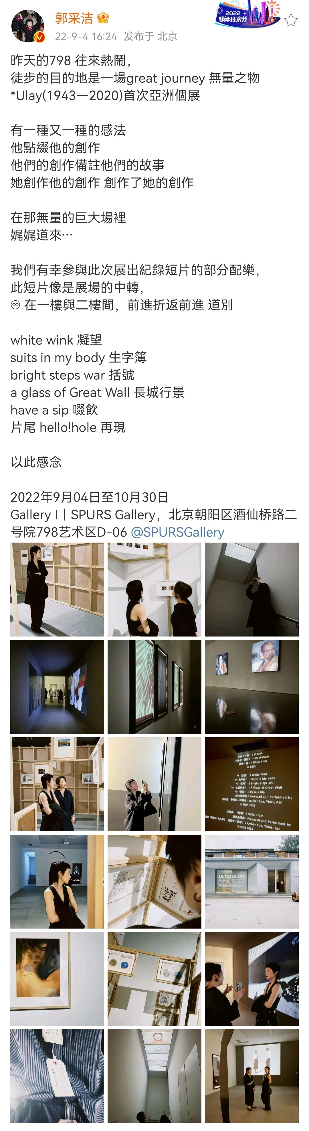 此外,郭采洁亦于近日受邀参加“乌雷:无量之物”展览的开幕活动,此次展览是一次穿越乌雷艺术作品与生活的旅程,郭采洁记录下一幅幅珍贵的作品,并在社交平台中写下此次看展的感悟“有一种又一种的感法,他点缀他的创作,他们的创作备注他们的故事,她创作他的创作 创作了她的创作。”“在那无量的巨大场里,娓娓道来......”同时,值得一提的是,郭采洁及其厂牌“游牧城市”还参与创作了此次展会纪录片的部分配乐,以此感念行为艺术无可争辩的艺术先驱。