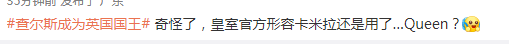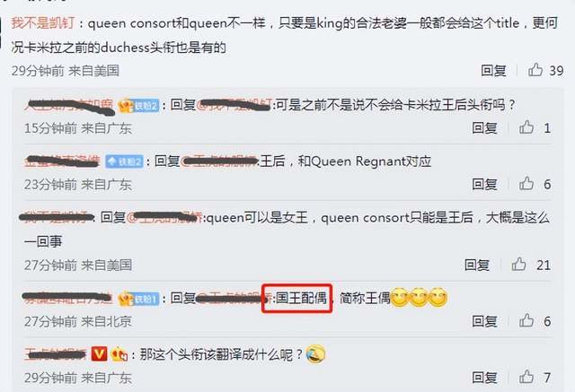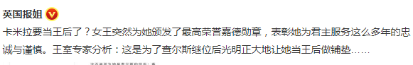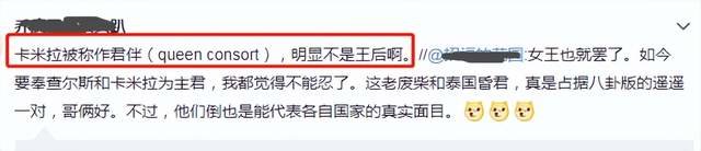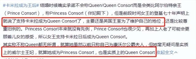 还有网友称卡米拉确实成为王后不是伴妃,也是女王伊丽莎白二世为了维护自己的地位支持的。同时,还称即使卡米拉没有Queen的头衔,但是实际上就是王后,就好比没有当成王妃,也是实际意义上的王妃。