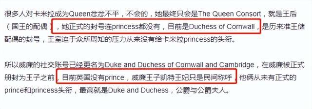 而且,王室迫于舆论压力从来没有给过Princess头衔,还提到威廉王子已经把社交账号更名为“Duck and Duchess of Cornwall and Cambridge”(康沃尔和剑桥公爵及公爵夫人),在威廉正式被册封为王子之前,英国没有Prince,威廉王子凯特王妃都是民间称呼,他们俩没有头衔,最高就是公爵与公爵夫人。