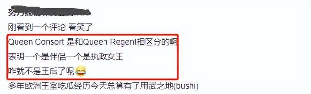 有网友称“The Queen Consort“是君王伴侣的意思,明显不是王后。Queen Consort,是King的配偶统称,指的就是国王的配偶,只要是国王的合法老婆都能使用这个头衔,更何况卡米拉之前的Duchess头衔也是有的,Duchess是公爵夫人的意思,而真正的王后用语是“Queen Regnant”。