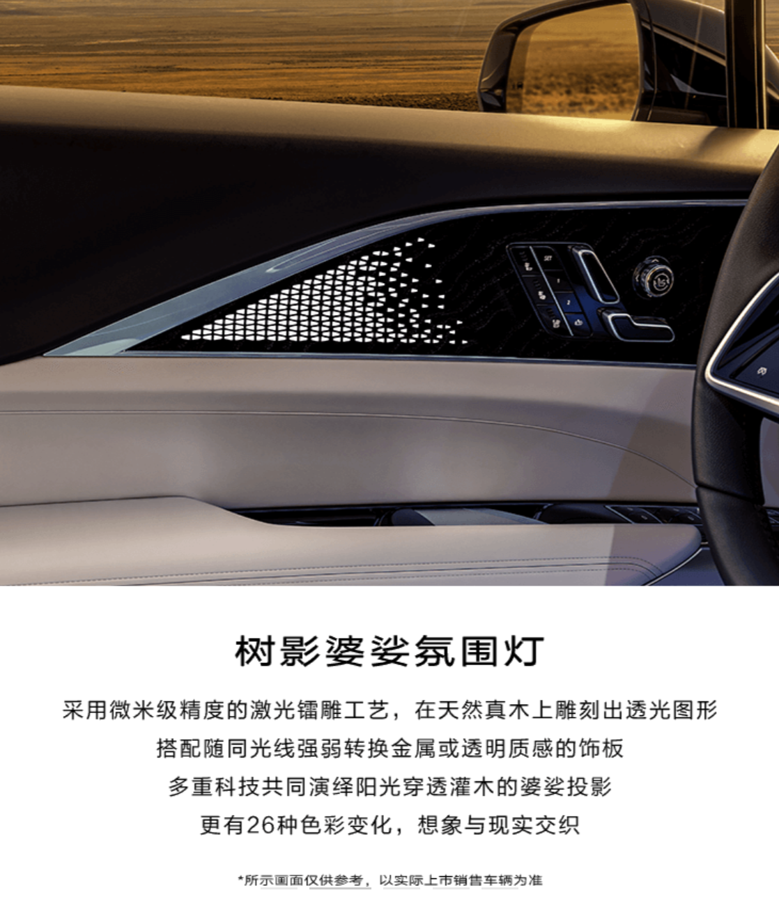 凯迪拉克LYRIQ的驾驶舱内的设计同样是令人耳目一新,全系标配33英寸环幕式超视网膜屏就已经超越了同级对手,提供9K超高分辨率,可显示10亿种色彩,毫不夸张的说,这块屏幕的素质领先业界3年以上。内饰采用40年树龄白栓木,经过对木材纹理的人工挑选,再经微米级精度的激光镭雕工艺雕刻出树影斑驳的镂空花纹,非常高档,配合26色氛围灯,打造独特的树影婆娑氛围灯,氛围感满满。
