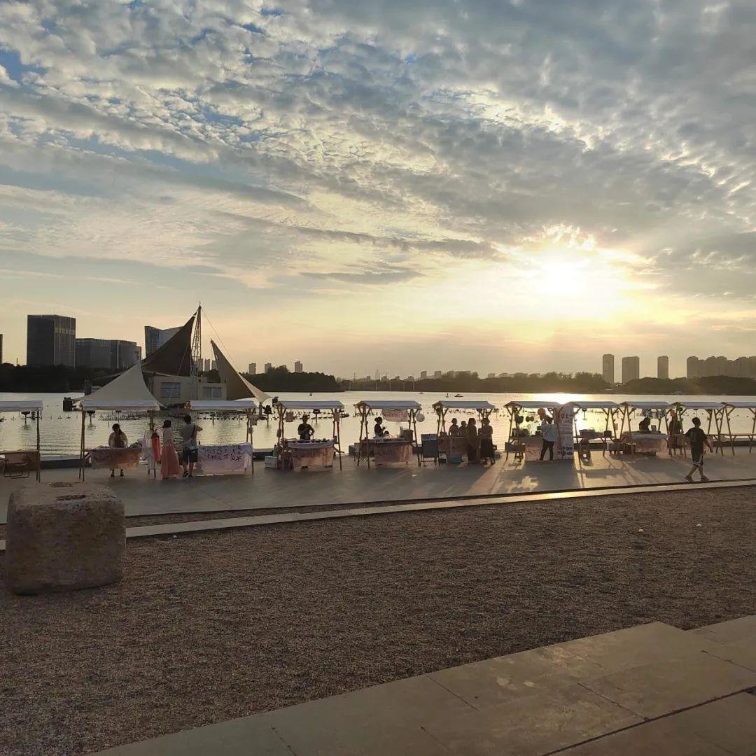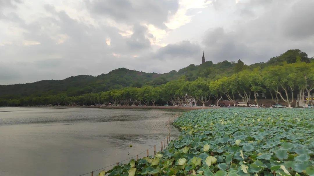 秋天将至,湖畔的荷塘依然有荷花开放,一群野生水鸡在湖中嬉戏,雷锋塔在夕照中若隐若现。白堤、苏堤横跨两岸,几栋西式老楼矗立湖畔,飘散出浓浓的咖啡香。