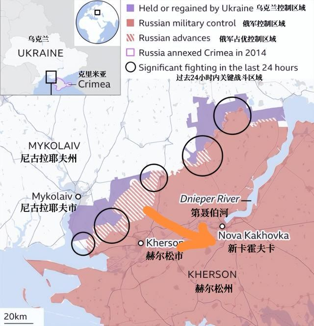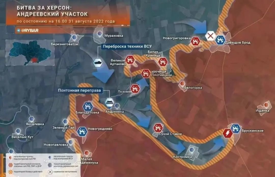 而俄军准备通过第聂伯河,从南岸向北岸的后勤补给,在乌克兰强大的远程重火攻击下,基本中断——船只很难通行、浮桥都很难搭建,其只能通过新卡霍夫卡向北岸陆地侧向补给。