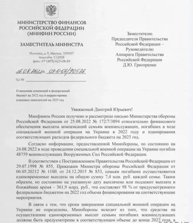 9月8日,乌克兰公布俄罗斯财政部的文件:8月26日,俄副财长给俄罗斯副总理兼政府办公厅主任格里戈连科上报“公函”,主要内容是修改2023年预算,将对在乌克兰特别军事行动中阵亡的俄罗斯军人家庭的一次性补助纳入其中。 “公函”称,截止今年8月25日, 共有48759名俄罗斯军人在乌克兰阵亡 ,每个阵亡军人家庭需要补助730万卢布,总共需要补助3619亿卢布,补助任务将在年底启动,于2023年完成。迄今为止,俄罗斯官方尚未对“公函”真伪进行表态。