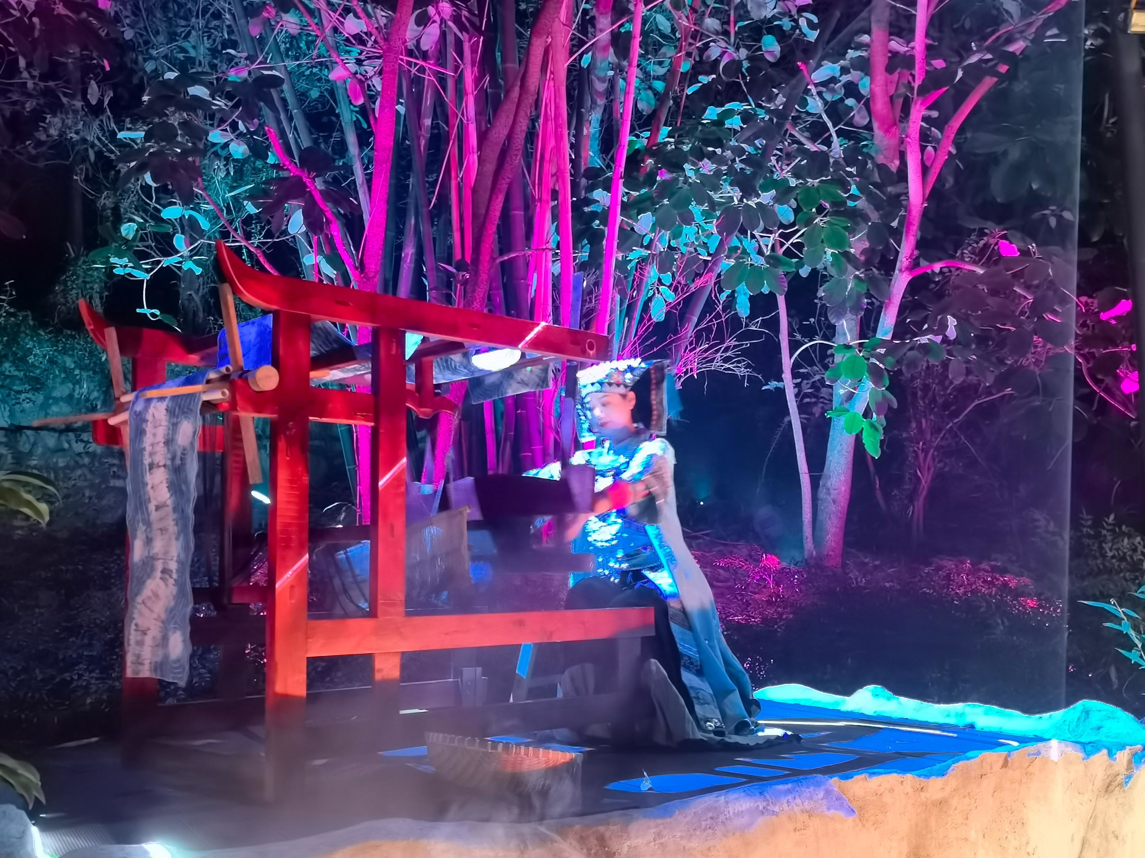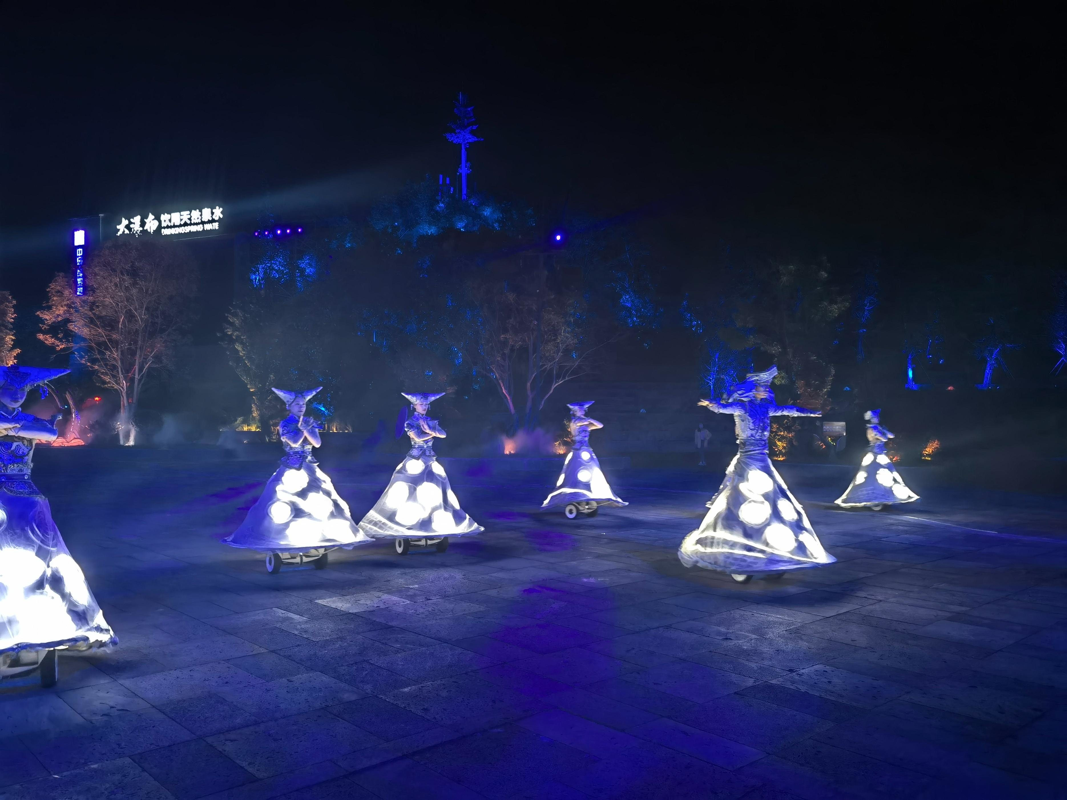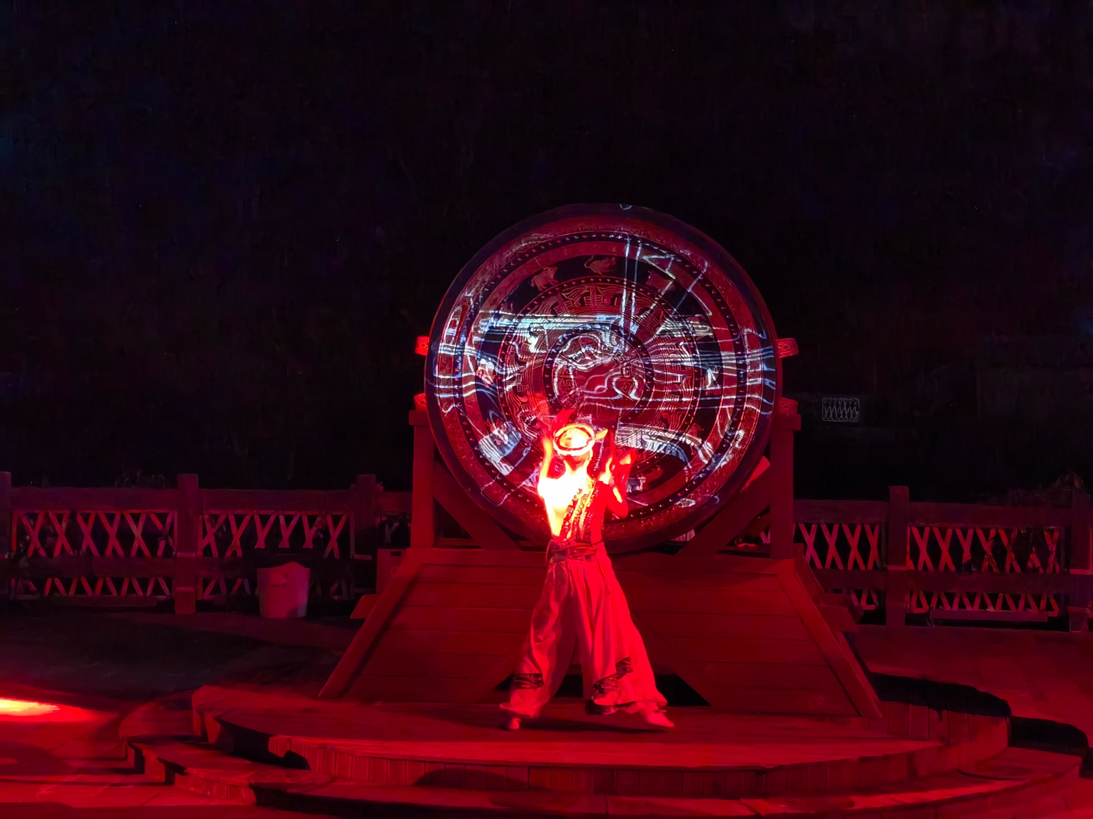 3D效果的大鼓,鼓声酣畅,波澜壮阔,和背后的大山上形成的夜郎图案形成呼应。