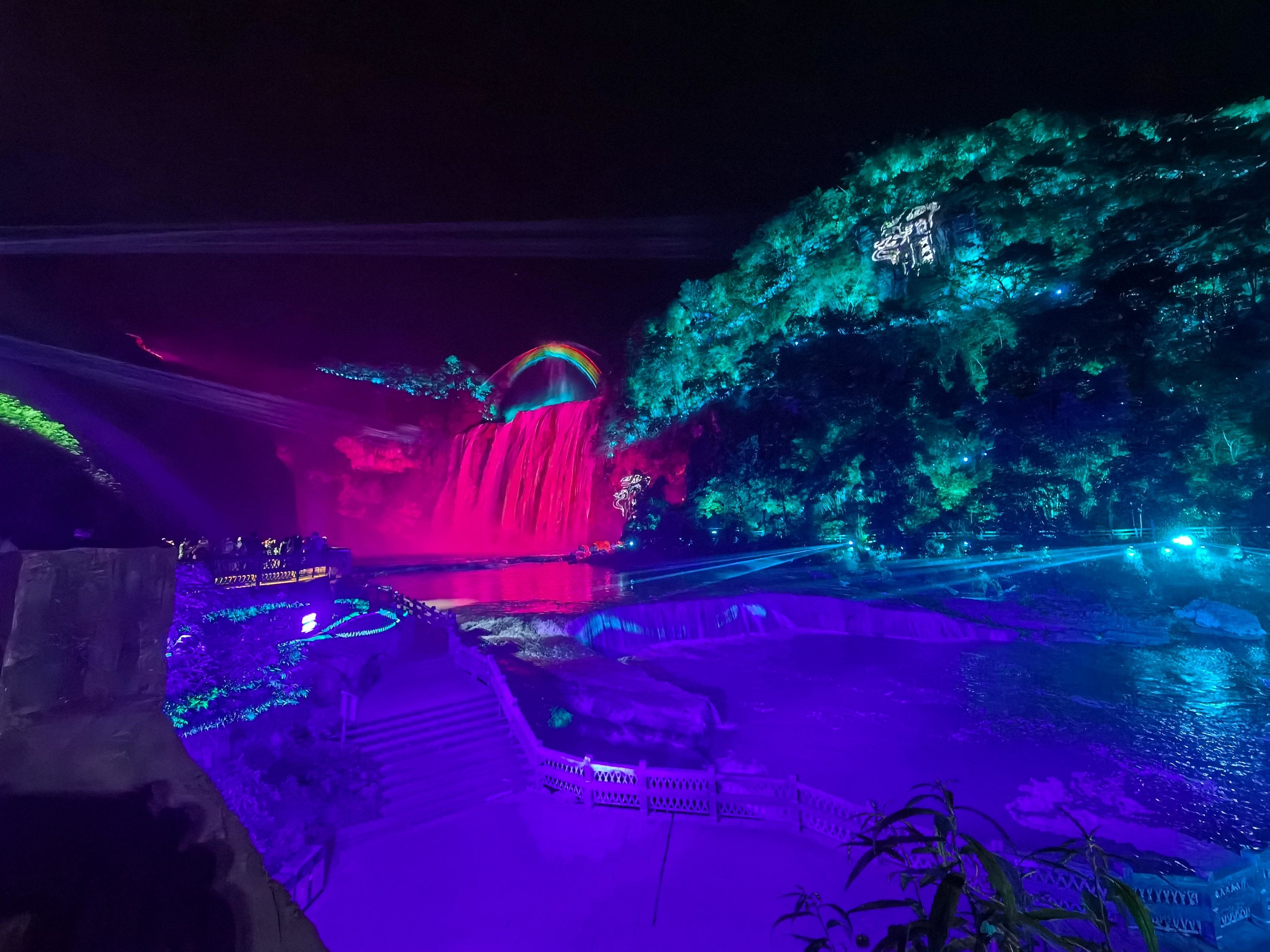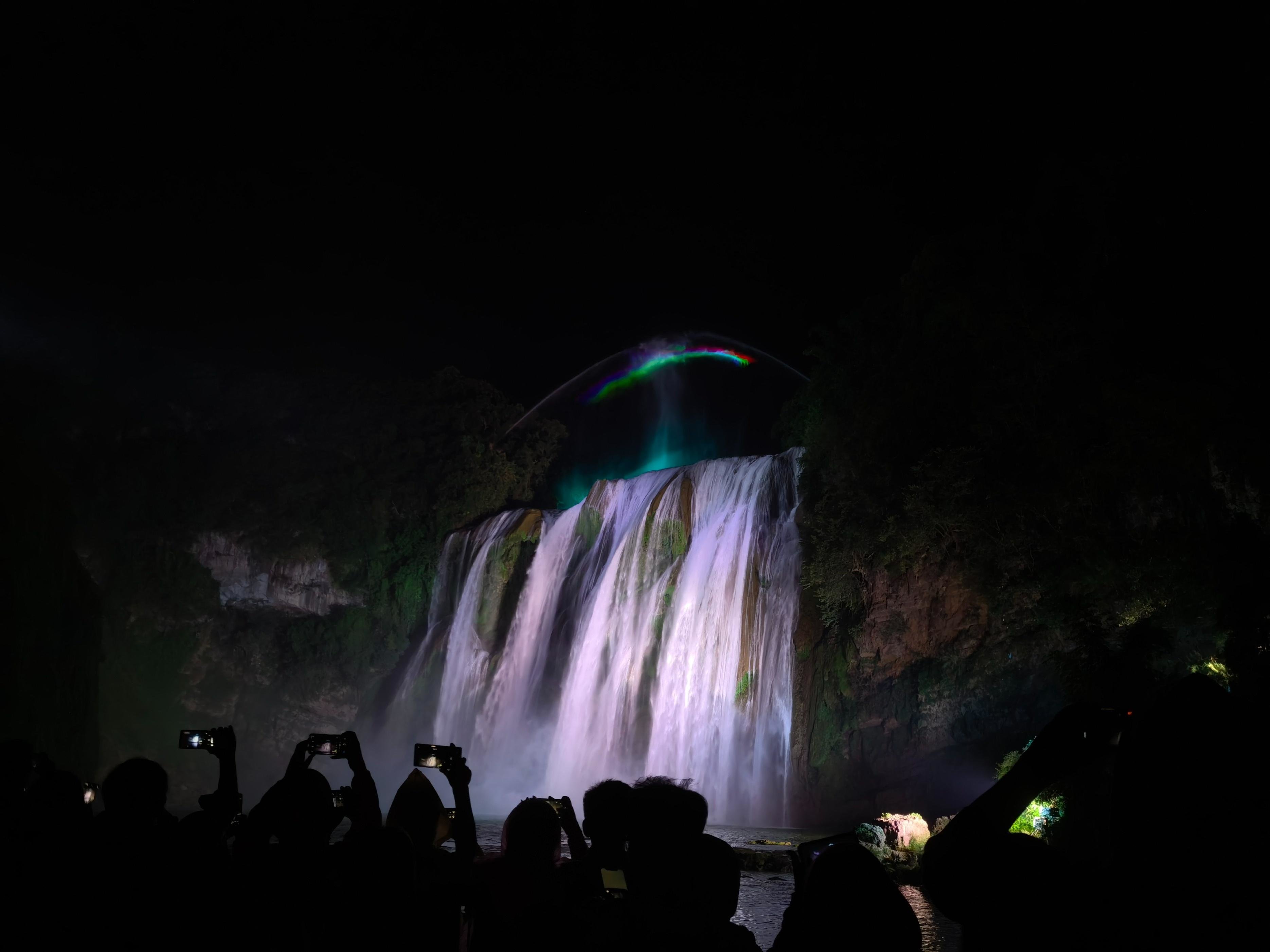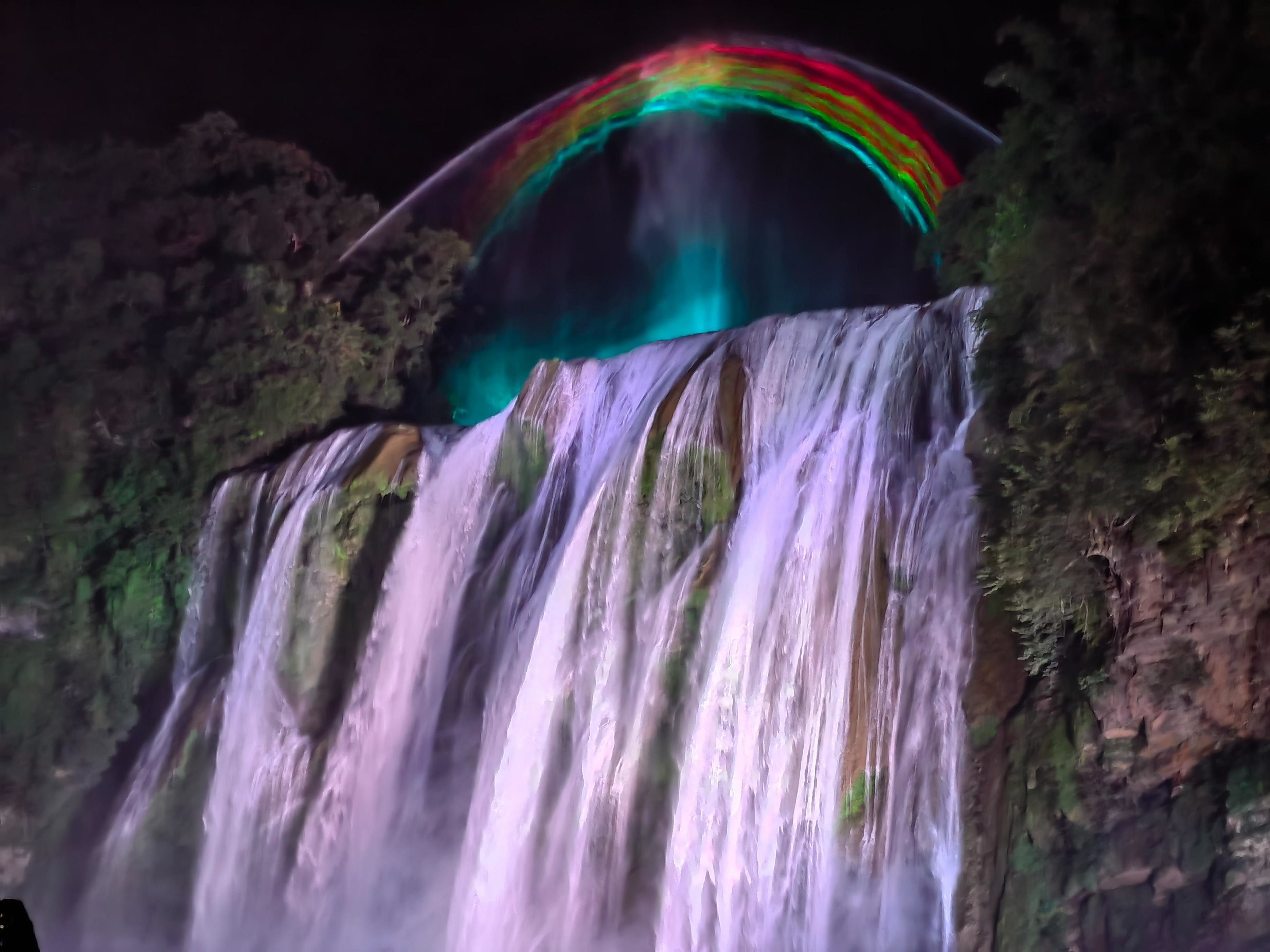 最清晰的一张,灯光在黄果树瀑布上打出了美丽的彩虹,奔流而下的瀑布就像油画一样。,