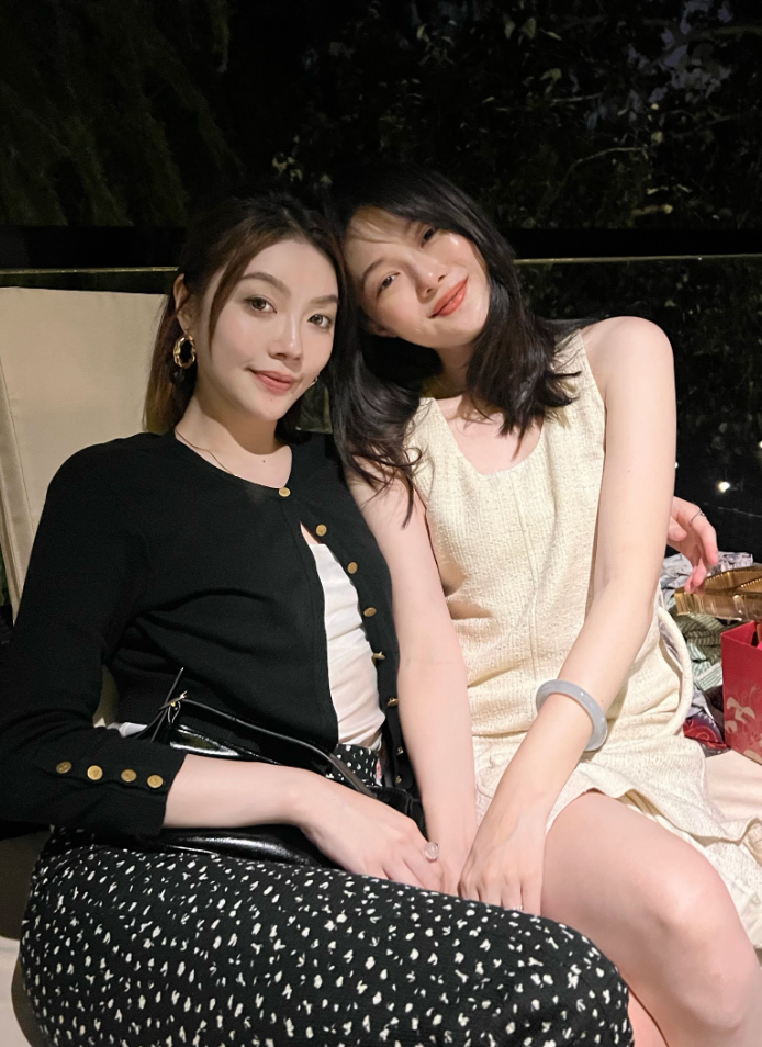 之后,她又晒了晚上和家人们聚在一起赏月闲聊的照片。照片里晚晚已经把外套脱了,和妹妹雷婉婷互相靠在一起,直角肩特别突出,翘着二郎腿风情万种,手上的玉镯凸显几分名媛贵气。雷婉婷五官似乎更立体,据了解她曾去美国留学读艺术史,也算学霸一枚。