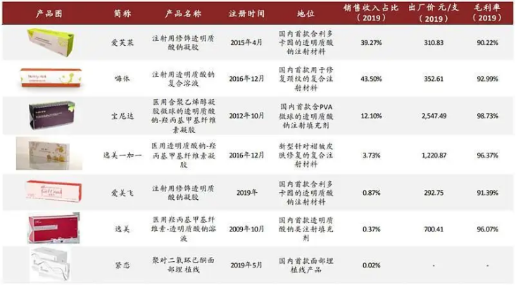 相关资料显示,爱美客是国内获批用于非手术医疗美容Ⅲ类医疗器械数量最多的企业,其目前已上市的7款产品中,包括5款“玻尿酸”(基于透明质酸钠的系列皮肤填充剂)、1款“天使针”(基于聚左旋乳酸的皮肤填充剂)、一款PPDO面部埋植线产品“紧恋”。