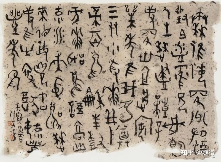 释文:九曲帆归渔父宅、四围春浸野人家。丽曲弦歌庆福祉、香车宝马迎宾朋。方舟出海寻仙境、神笔迎风逐水天。三更未雨泉声急、八月如春树色斑。鼓声曾夸梁红玉、童趣得尊安徒生。今夜高人偕鹤去、翌晨童子驭车来。甲骨文集联 徵者