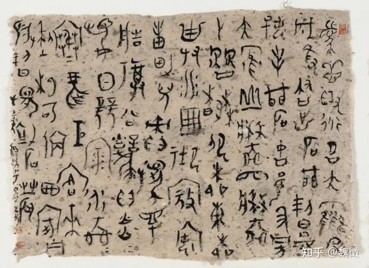 释文:古今学圃长尊孔夫子、中外童声齐夸安徒生。雨天鱼出水和声一片、如月鸟鸣春玉韵万千。天山下居延水光再现、戈壁中漠北绿野通明。衣食住行人生不可少、诗书画印乐事宜求多。法善得道名太鹤、文成获书出石门。甲骨文集联 徵者