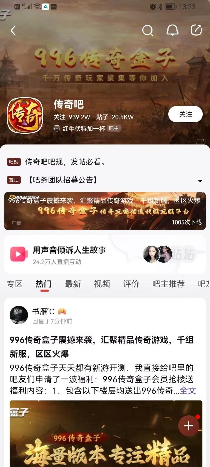 在玩家们的口口相传和市场效益催动下,996传奇盒子的名气是越来越响亮了,相关的推广也大幅度增加。于是最近我们看到它打出了让人目瞪口呆的骚操作,直接在几百个传奇相关的贴吧里置顶超大广告,吸睛量一波拉满。