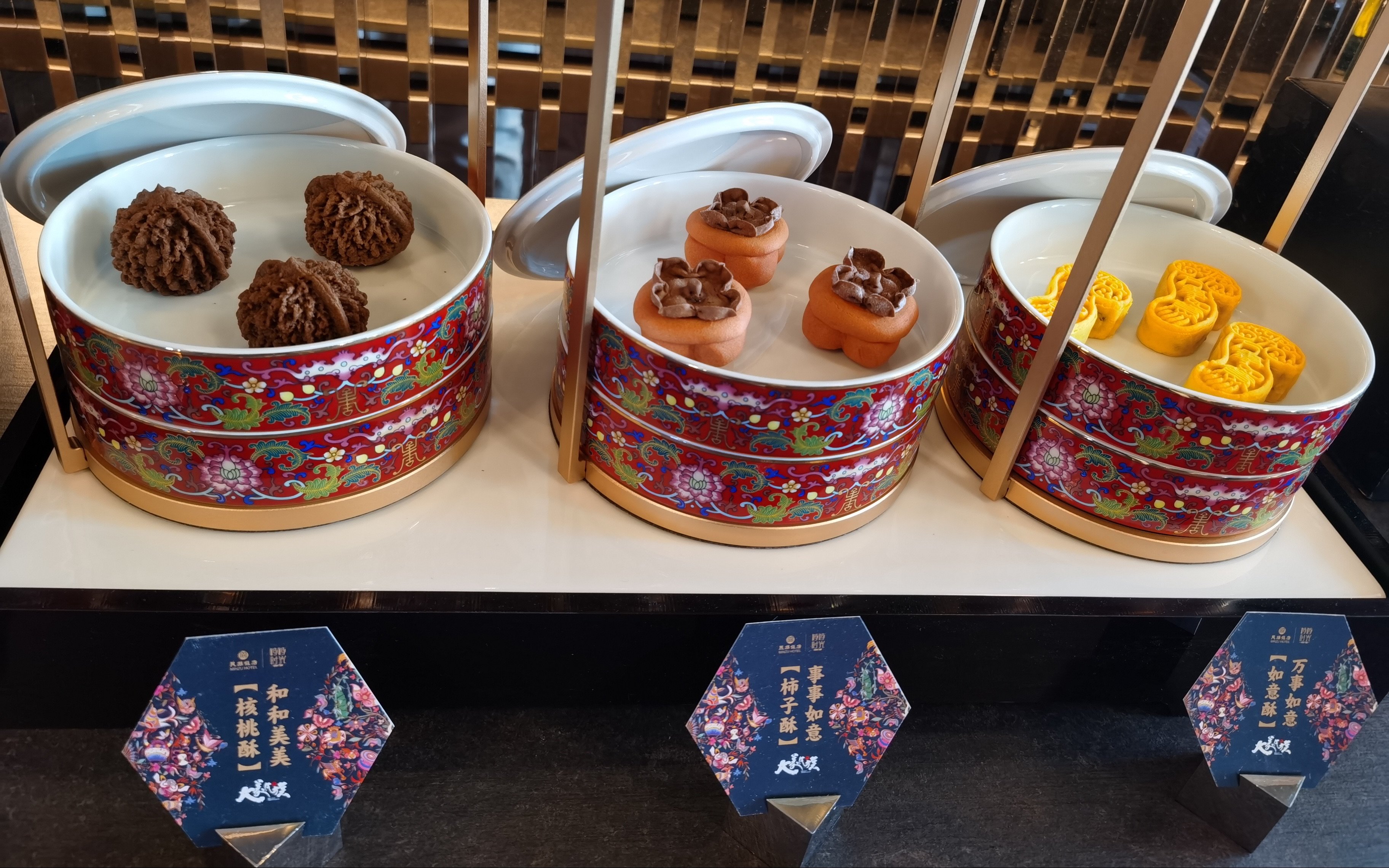 民族饭店带到现场的茶点,核桃酥、柿子酥和如意酥。新京报记者 陈琳 摄
