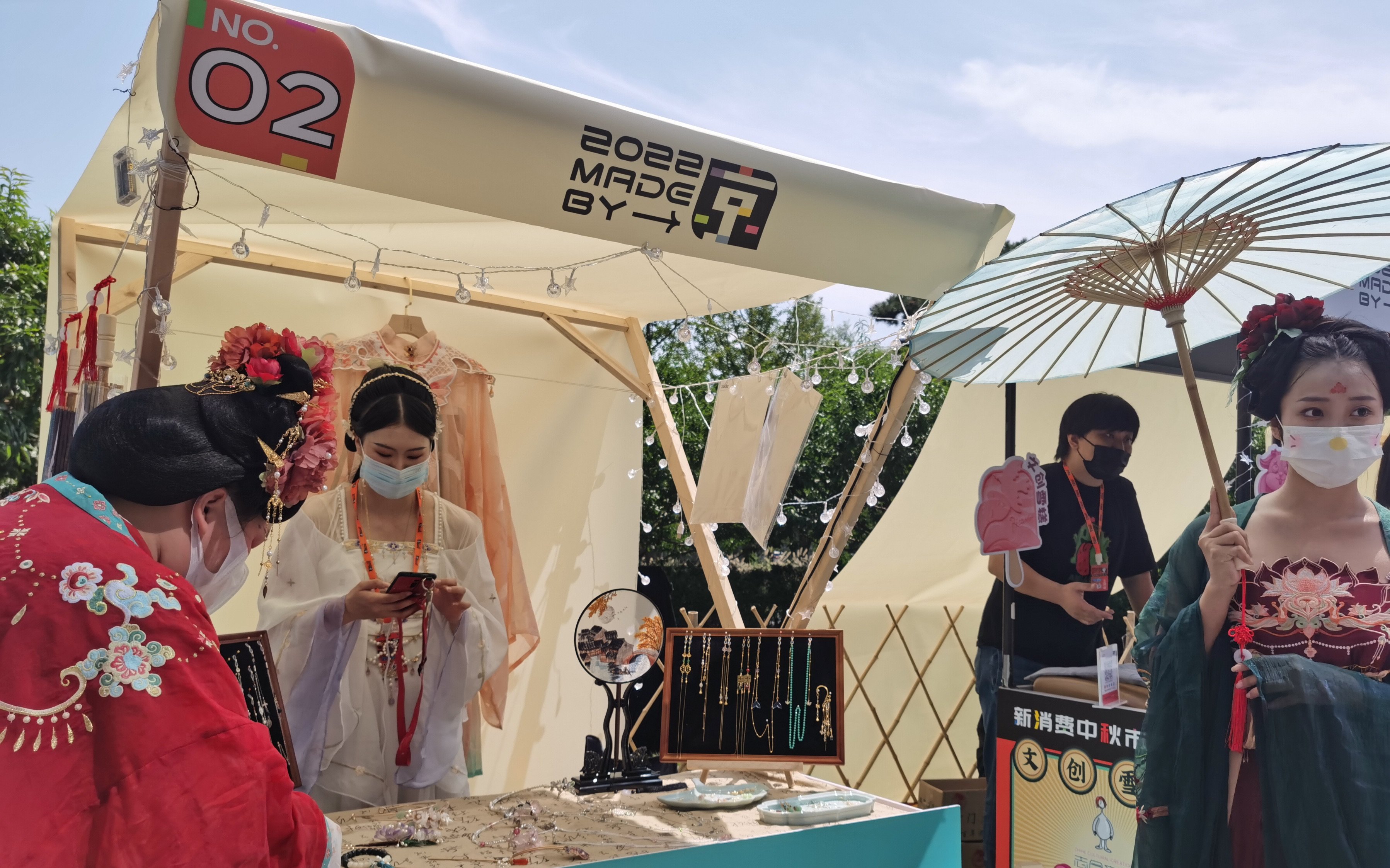 身着汉服的模特在集市现场展示手工制作的饰品。新京报记者 陈琳 摄