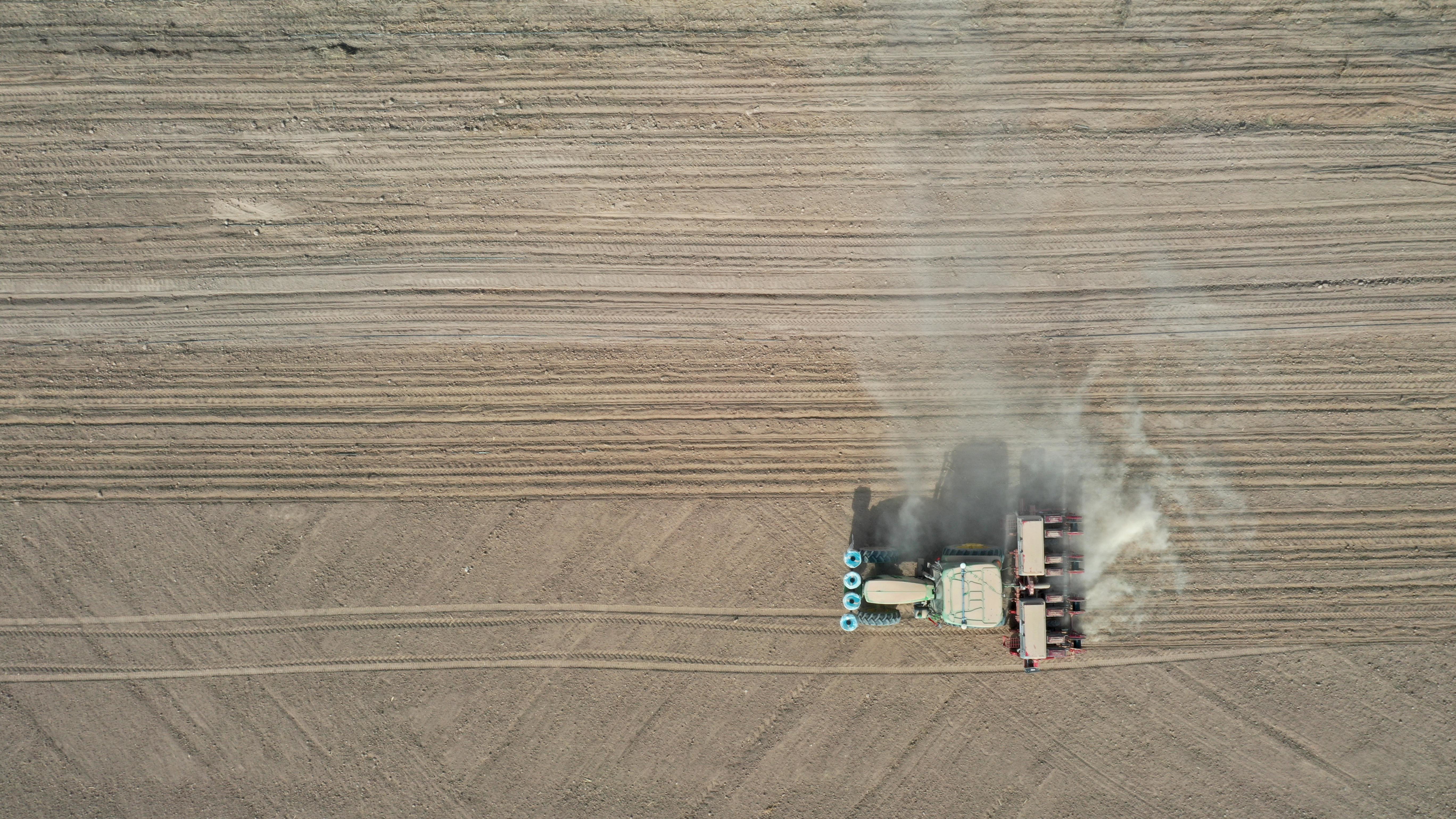 无人驾驶机械在北斗导航系统的辅助下在田间作业(无人机照片,5月27日摄)。新华社记者 冯开华 摄