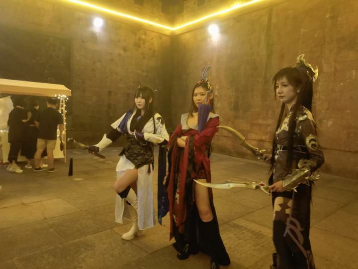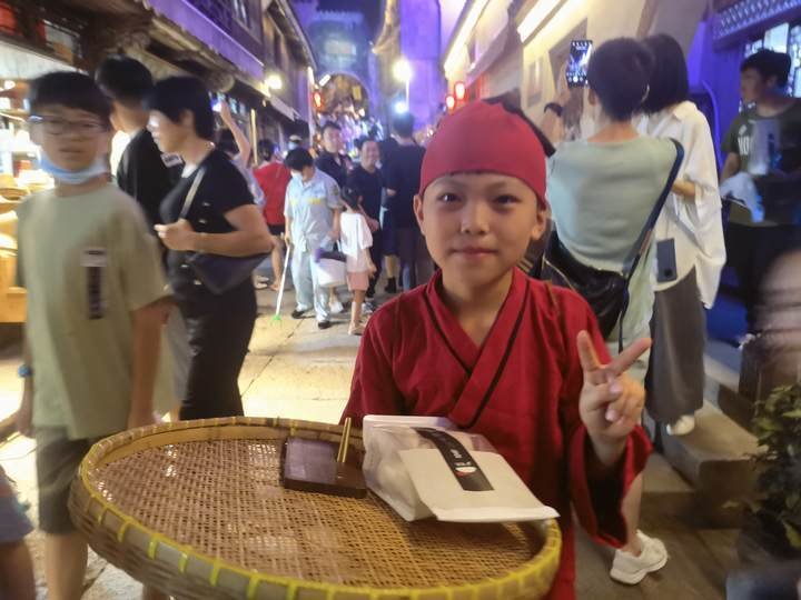 在石浦古城,也是一片欢乐海洋。人们踱着碎步,挽着亲朋的手,看花灯、品美食,还有古装表演和cosplay秀。卖米馒头的古装小朋友吸引了很多游客拍照。
