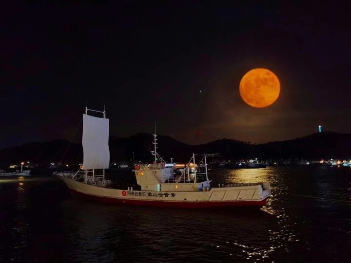 昨晚,最华丽的舞台设在渔港中央的一艘船上。船上升起了风帆,帆上挂着一轮圆月在缓缓变化成为超级大月亮。而在对面的东门岛上,伴随着美丽的灯光秀,真正的月亮在海上升起,与彩云追逐轻舞。