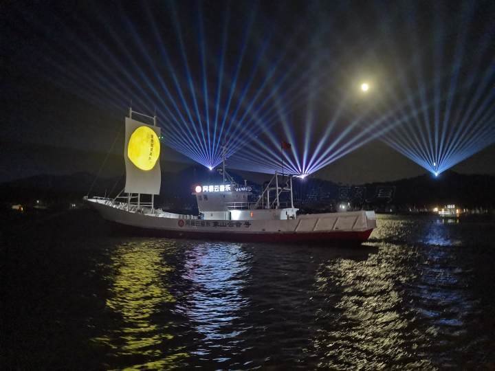一个海面,两个“月亮”。船名叫“象山云音号”,船上有渔民唱着渔歌号子,而超级月亮上,则滚动播放了网友们的乐评和中秋祝福。