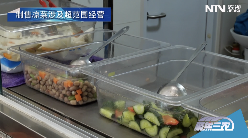 售卖凉菜的柜台后方就是餐馆的整个后厨,记者并未看到有单独制作凉菜的冷荤间, 而在商家张贴的食品经营许可证上也没有冷食类食品制售的标志, 显然这家店属于超范围经营。
