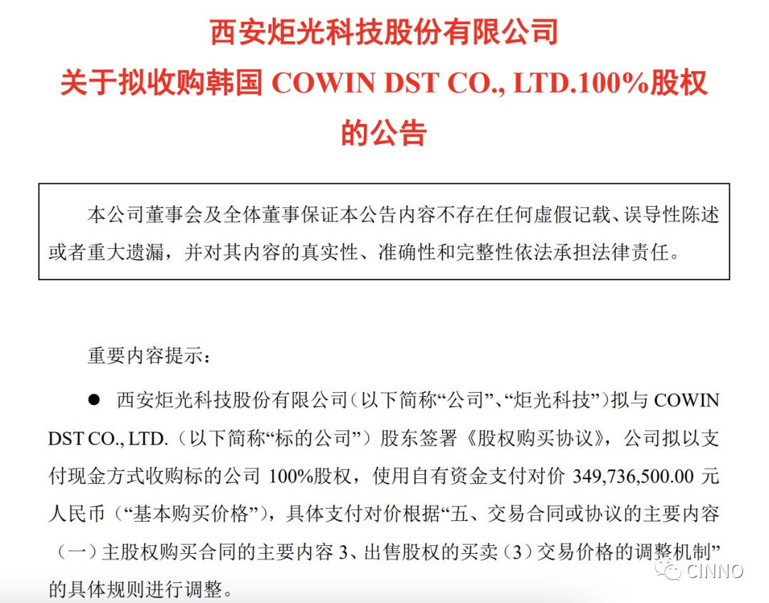 炬光科技公告,公司拟与韩国COWIN DST CO., LTD.(“标的公司”)股东签署《股权购买协议》,公司拟以支付现金方式收购标的公司100%股权,使用自有资金支付对价3.5亿元人民币(“基本购买价格”)。