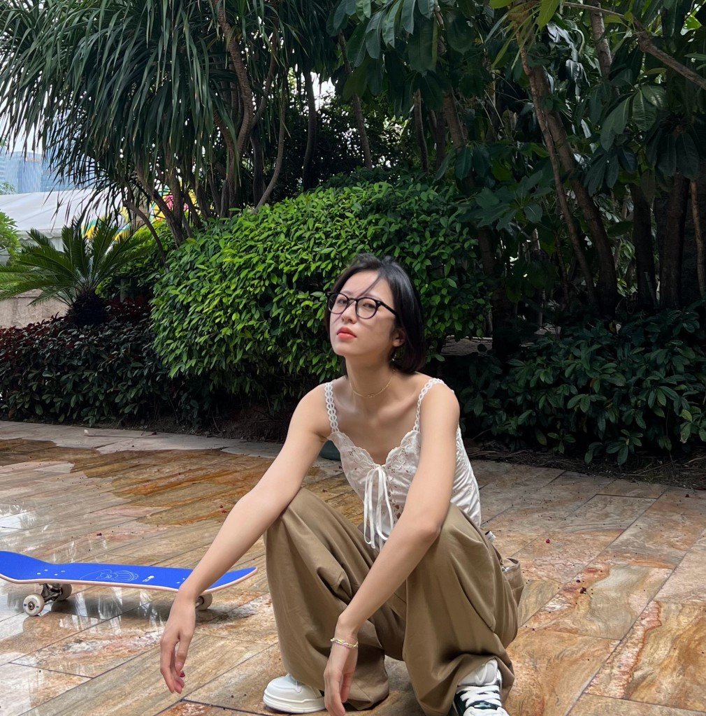 2022年9月9日,周雨彤发布户外滑板写真 身穿白色吊带搭配咖色工装裤。