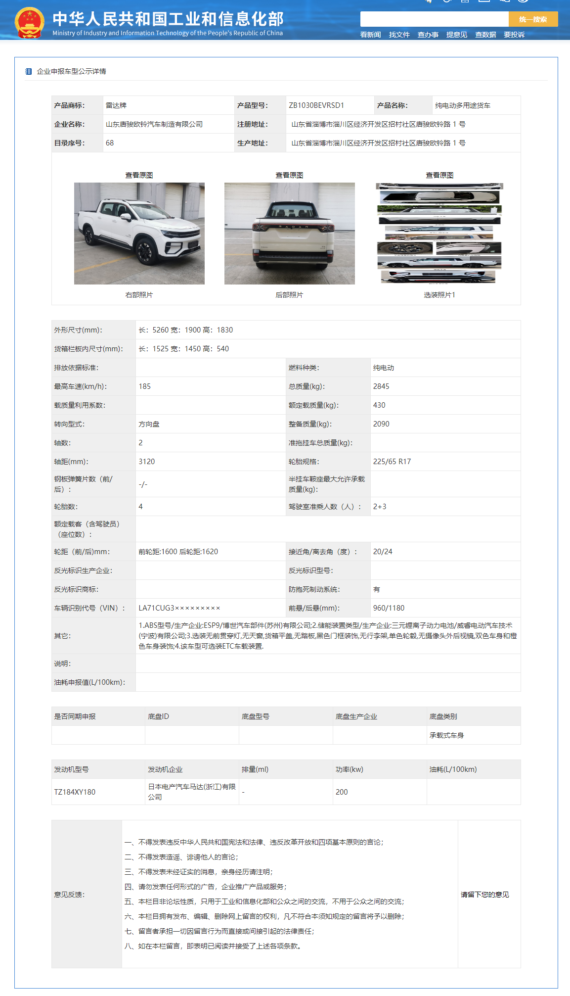 现在,雷达 RD6 已经通过了工信部申报,新车由山东唐骏欧铃汽车制造有限公司制造,将于今年上市,“0 元预定”通道已开启。