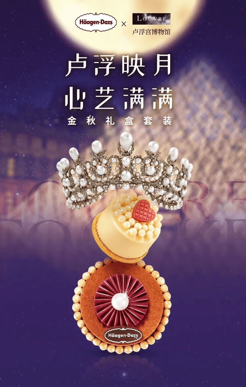 哈根达斯携手法国卢浮宫博物馆,推出了“璀璨月圆”金秋礼盒,月饼造型还融合了卢浮宫王宫建筑群,颜值爆表。