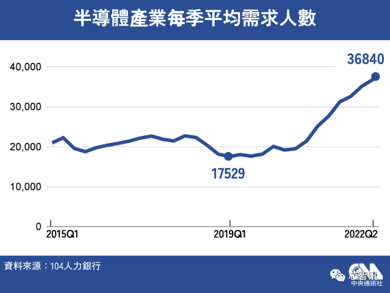 根据台湾104人力银行最新发布的《2022年半导体人才白皮书》,半导体产业人才需求自2020年第3季开始走升,2021年第1季起持续创新高,到了今年第1季平均每月需求已窜升至3.5万人,年增幅高达39.8%;半导体产业无畏近年国际局势动荡,逆势大爆发,更加剧“求才若渴”状况。