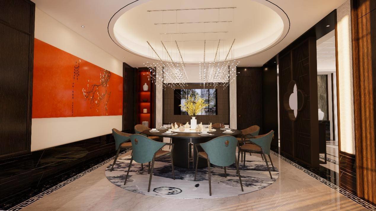 餐厅与会客茶室之间,以造型木格栅为隔断,形成了隔而不闭,通透明朗的流动感,以亮眼的中国橙硬包造型墙做穿透呼应格外吸睛,让用餐区彰显出别具一格的雅静气质。