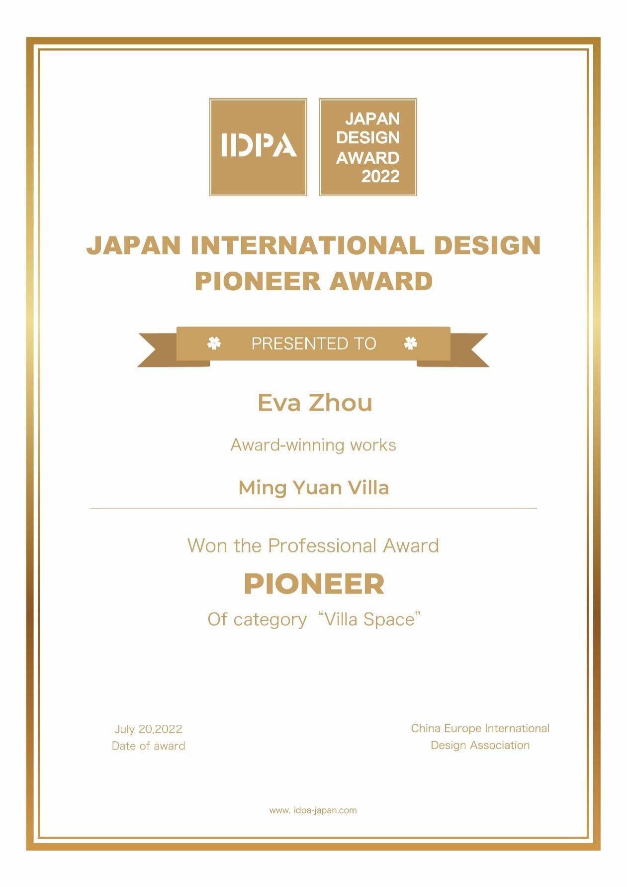 本届日本IDPA AWARD国际先锋设计大奖共收到来自法国、意大利、西班牙、日本、中国及港、澳、台湾等全球几十个国家地区的知名设计师和设计机构报名,申报设计作品近三千套,最终经日本国际评审团:评审团主席笈川诚先生、国际著名设计师長谷川演先生、寶田陵先生、谷山直義先生、五十嵐久枝女士、笠原英里子女士、小坂竜先生、米谷先生、永山祐子女士商讨评选,周琳女士设计作品《MingYuan Villa》从全球众多参赛作品中脱颖而出,荣获别墅空间类别国际先锋设计大奖!