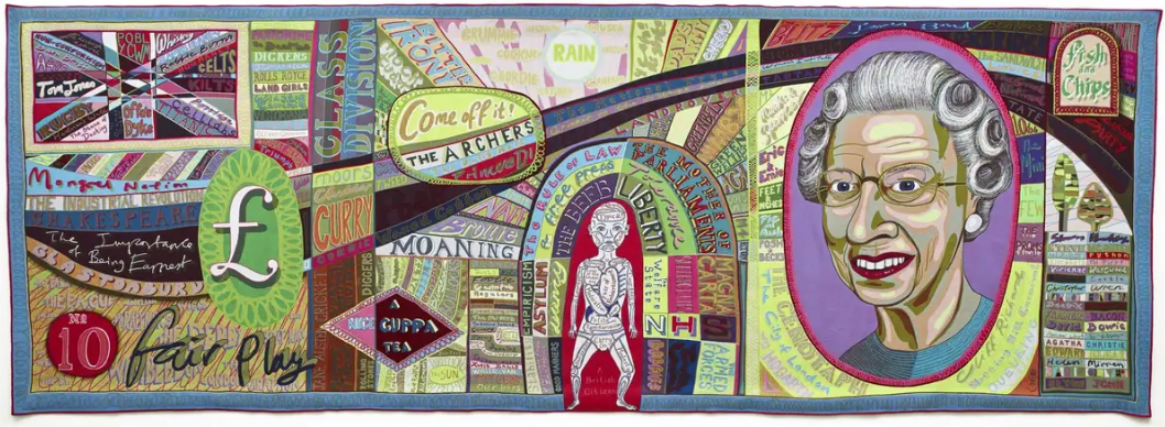 伦敦艺术大学(University of the Arts London,简称:UAL)校长、英国艺术家格雷森·佩里(Grayson Perry)的作品《舒适毯》(Comfort Blanket)完美总结了我们对君主制和女王本人的多元态度,表明伊丽莎白女王的形象与玛莎百货 (Marks&Spencer,简称:M&S) 或阶级划分一样,是英国的一部分:无论我们爱她还是真的爱她恨她。