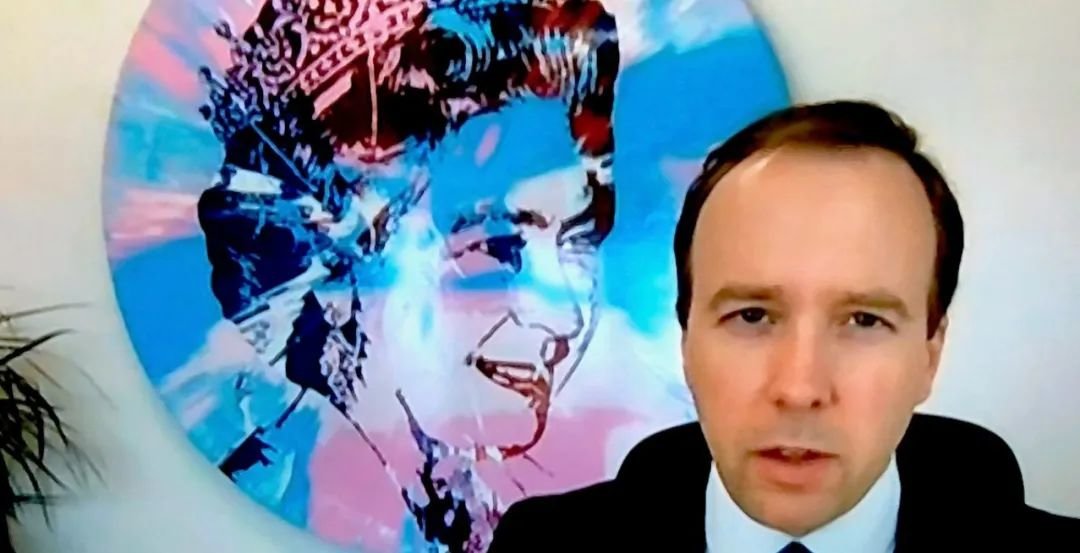 ▲ 2020年,卫生部长马特·汉考克(Matt Hancock)在 YBA 艺术家达明·赫斯特(Damien Hirst)的一幅“旋转艺术”画作前向全国介绍了 COVID19。这幅选自政府艺术收藏的画作,原保存于前文化司办公室。
