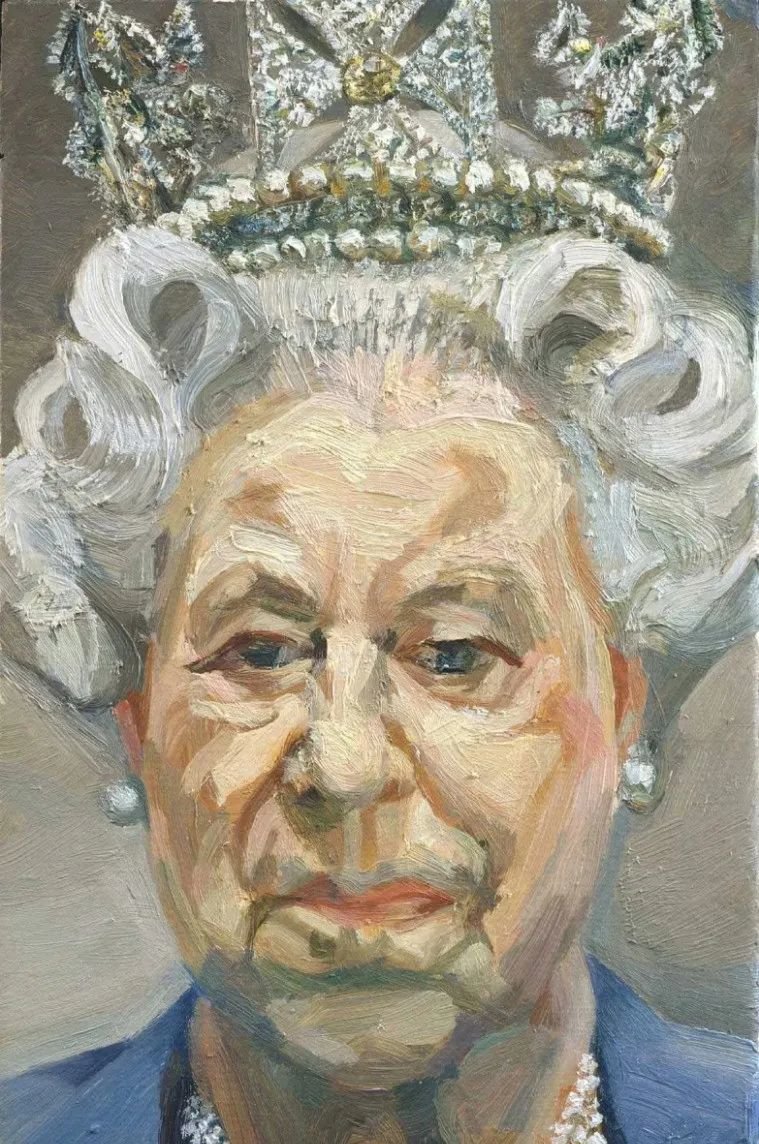 英国艺术家卢西恩·弗洛伊德(Lucian Freud)于2001 年受委托创作的女王肖像被称为“150 年来最好的皇室肖像”。这幅被弗洛伊德“扔进塔楼”的作品,曾因将女王画成“橄榄球运动员的脖子”和“柯基犬的脸”而饱受诟病,成为极具争议的皇室肖像。