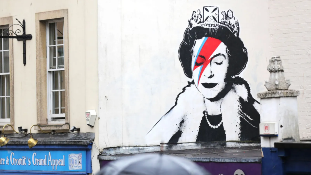 ▲ 班克斯(Banksy)在街头画的女王肖像,她的脸上画着蓝色和红色的大卫·鲍伊(David Bowie)风格的闪电