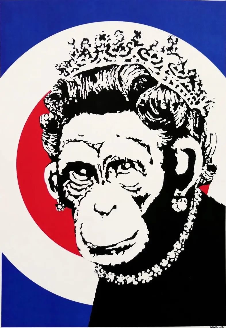 与此形成鲜明对比的是班克斯。这位出生于布里斯托尔的街头艺术家从不回避批评皇室,他的反体制理想无疑已经渗透到他对伊丽莎白女王的描绘中。创作于 2003 年的《美猴王》将伊丽莎白自己的脸换成了黑猩猩的脸,目的是(正如 Picture's On Walls 所描述的)“庆祝英国社会的最高职位不是对其才华或辛勤工作的奖励,而只是作为意外出生而颁发的”。