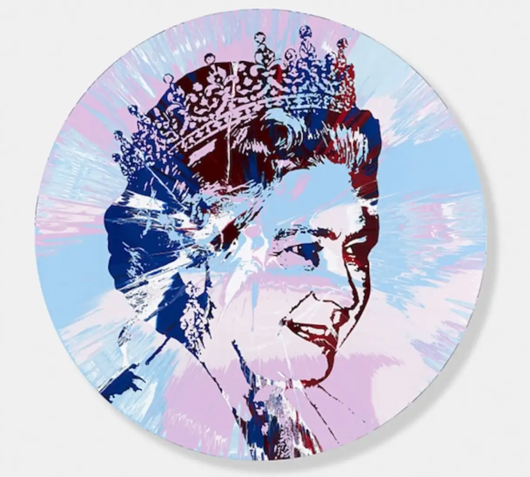 达明安·赫斯特于2014 年创作的《美丽的肖像:女王》使用艺术家标志性的旋转技术。赫斯特采用了在他早期系列作品《旋转》中的技法,在粉红色和蓝色的放射状背景下,描绘了一位微笑的伊丽莎白女王。有点让人联想到霓虹磅硬币,作品的小尺寸在这里暗示了一种亲密感。