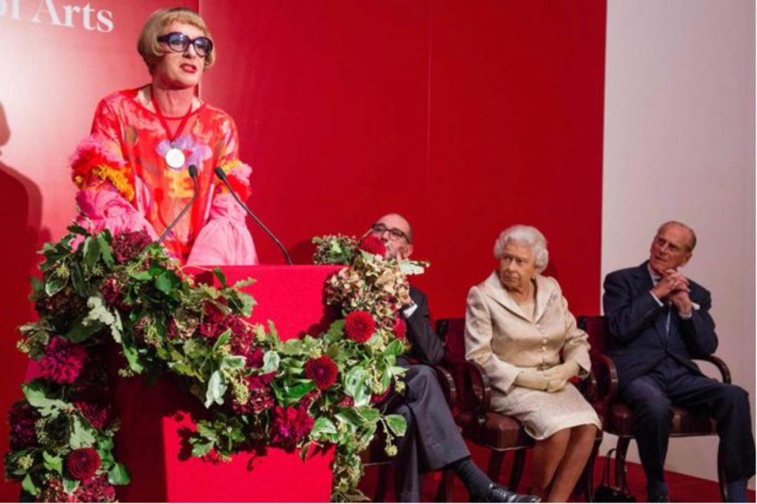 ▲ 2003年,特纳奖获得者格雷森·佩里(Grayson Perry)在英国女王和菲利普亲王面前演讲