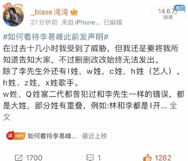 在9月12日中午,疑似李易峰事件女主角的账号blase湾湾发文爆料,手上有17位明星的同类丑闻。