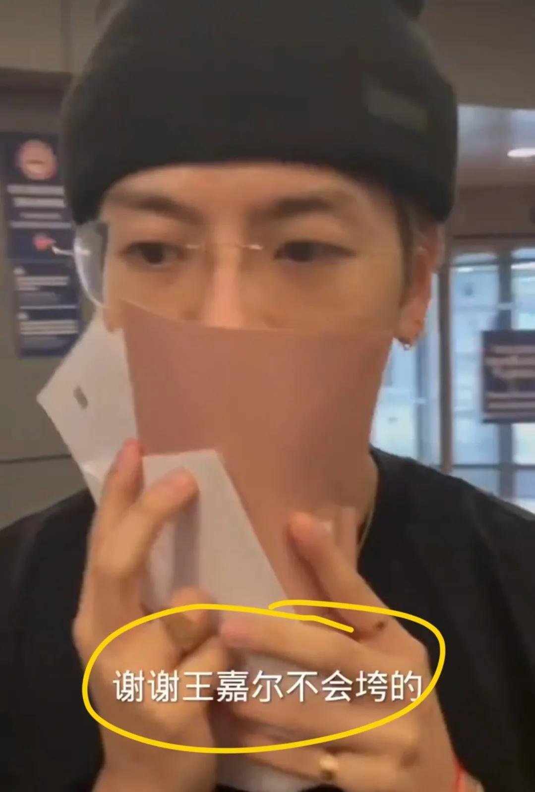 视频中,王嘉尔拿中疑似拿着机票,掩面不语,一群女粉丝围着他,当面对他说,“现在娱乐圈很多明星都垮了,王嘉尔千万不要垮,王嘉尔最棒!”