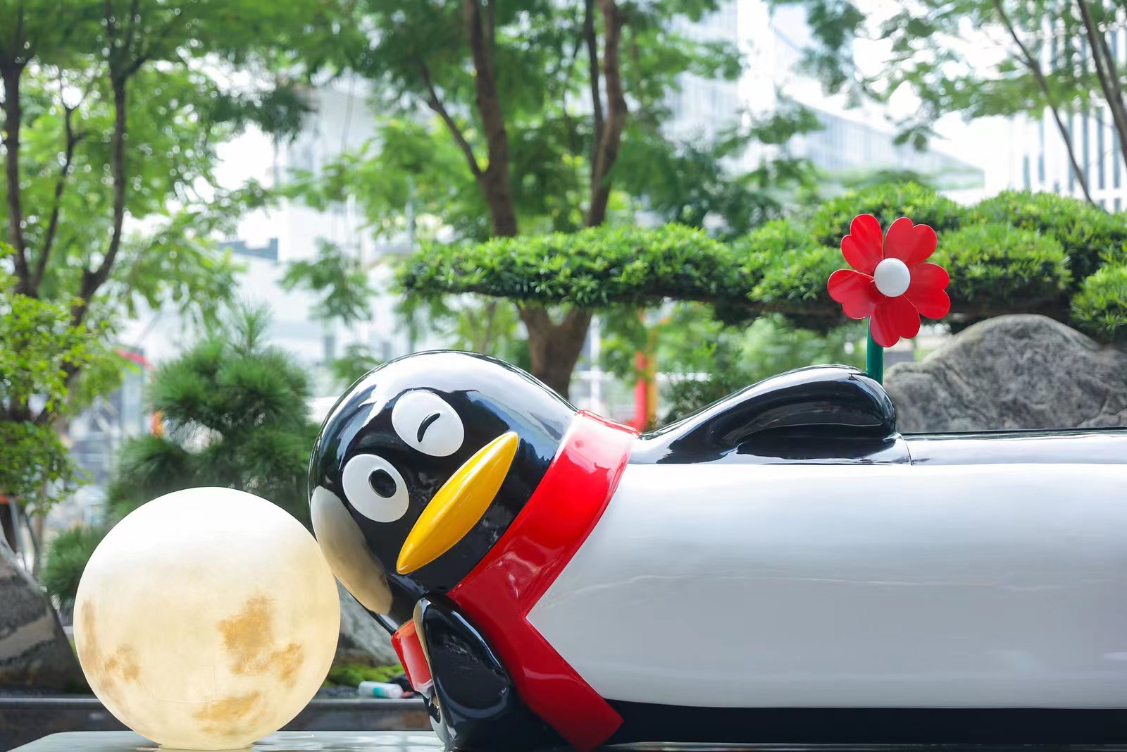 而那只手举一朵小红花、头枕“月亮”的侧卧长鹅,则直接在腾讯写字楼门前,收走了Q哥Q妹们手里的月饼。