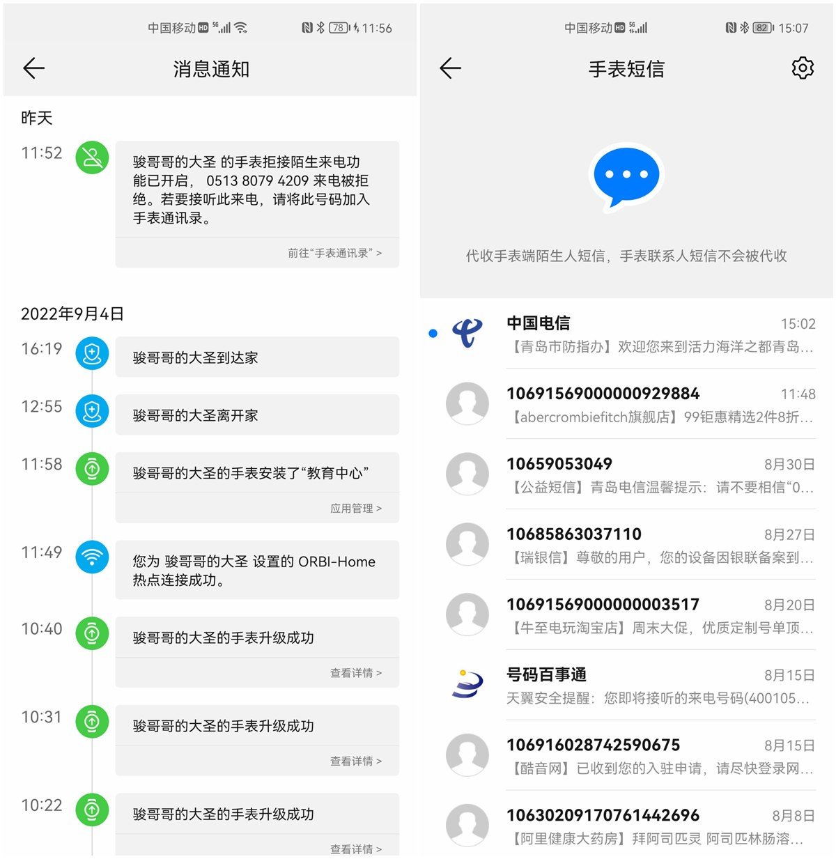 像日常的骚扰电话和短信,手表也会自动拦截,用户可在手机端后台查看。