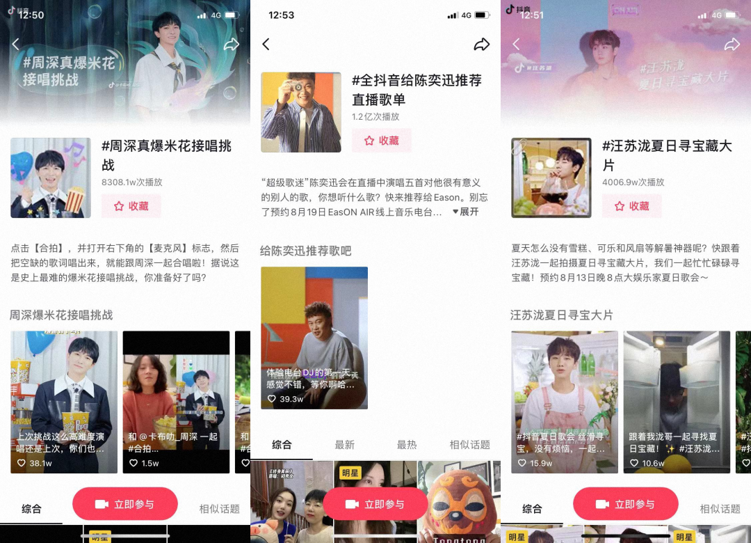 从挑战赛来看,从“周深真爆米花接唱挑战”到“汪苏泷正主玩梗三寻宝藏”,又或者是发动@柳岩、@张海宇 等明星及头部达人@井胧、@王不染、@Strictlyviolin荀博用翻唱、乐器弹奏等各种方式为陈奕迅推荐歌单,每一次挑战赛的发起,都是一次站内集中造势为直播预热的出圈过程。