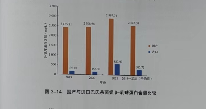 研究结果表明,2019-2021年,国产巴氏杀菌奶中β-乳球蛋白含量持续上升,平均值从2435.81mgL上升至2997.74mg/L,进口巴氏杀菌奶中β-乳球蛋白含量平均值从170.87mg/L上升至587.99mg/L。对比可见,国产巴氏奶平均值是进口巴氏奶的8倍多。