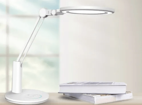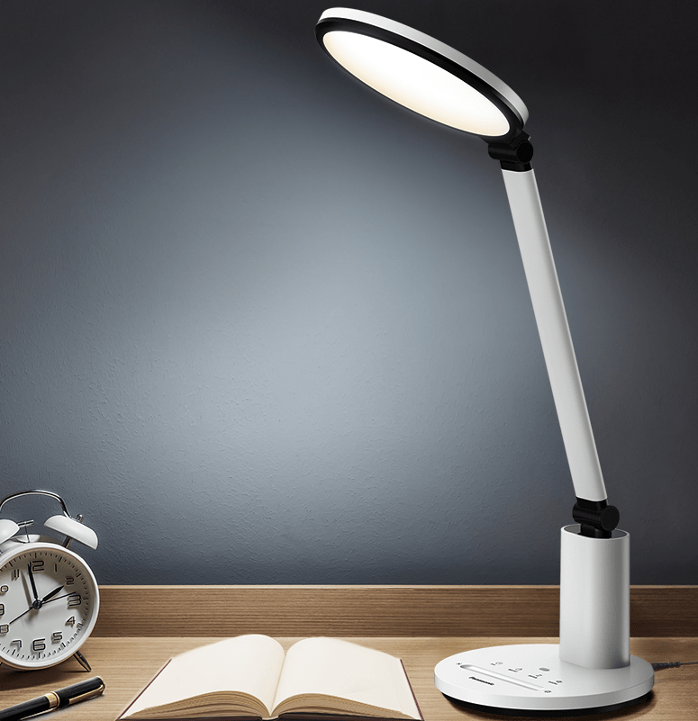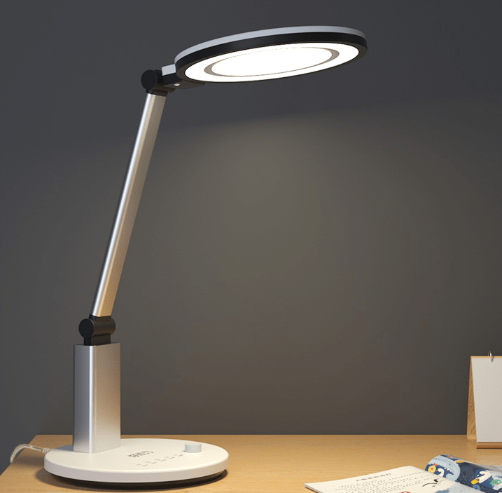 台灯有20cm的大圆盘,可以照亮整个桌面,采用环形侧发光技术,多次漫反射,柔和护眼,AAA级照明参数,做到无蓝光危害、无可视频闪、光线均匀灯,显色指数Ra98,内置有智能感光模块,可以自动增减光线亮度,45分钟模拟课堂时长定时休息,台灯用铝合金灯臂,并且灯杆可自由调节,稳重厚实的台灯。
